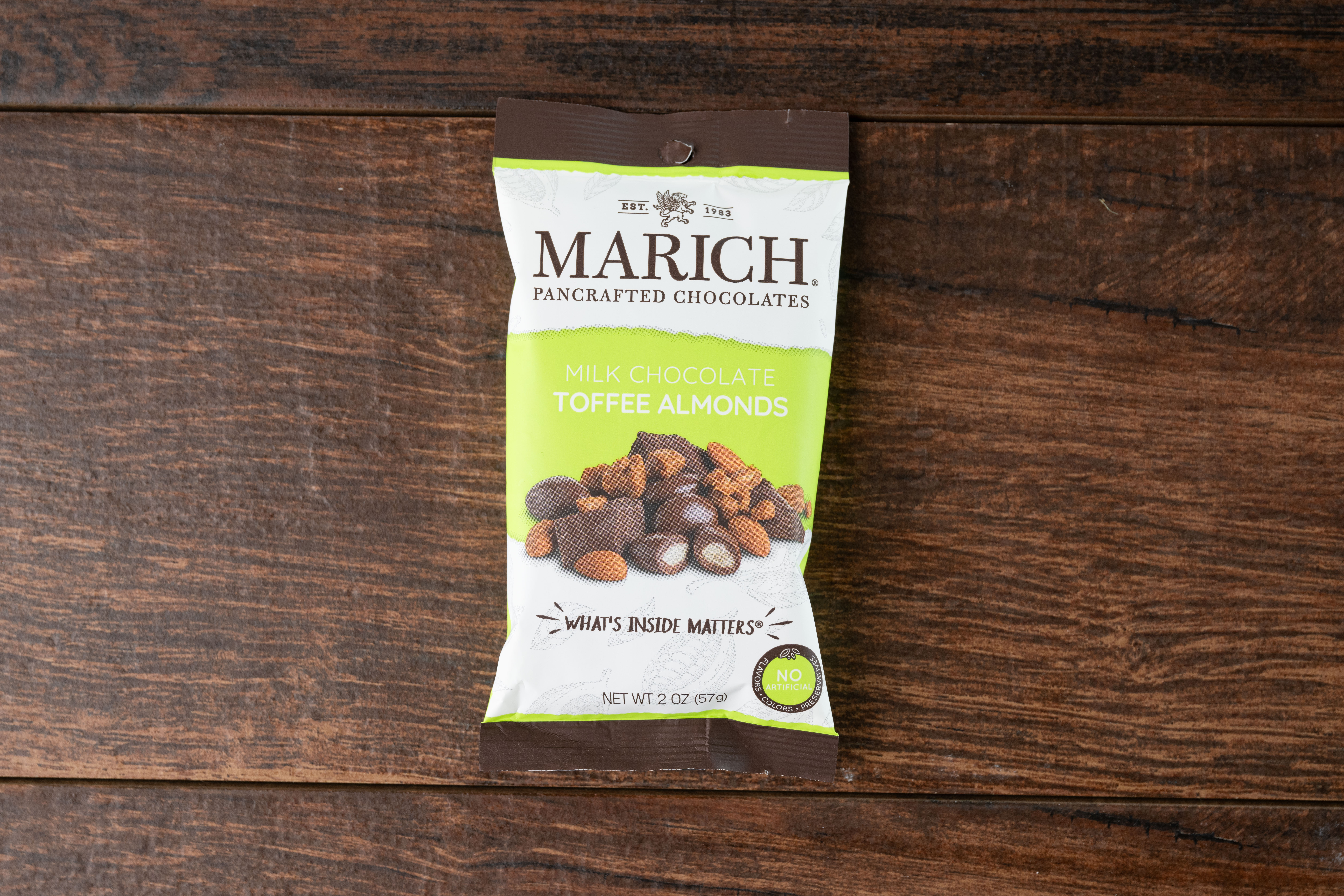 Roasted salted cashews, butter toffee cashews, dried strawberries, flame raisins, and sliced cranberries.